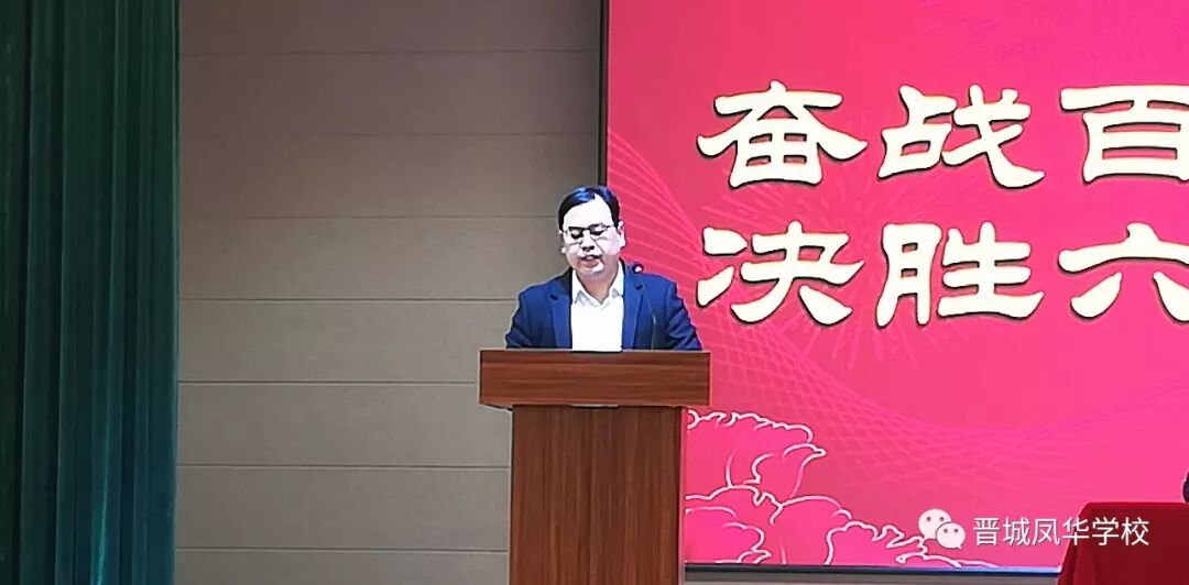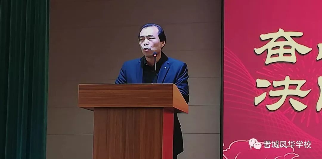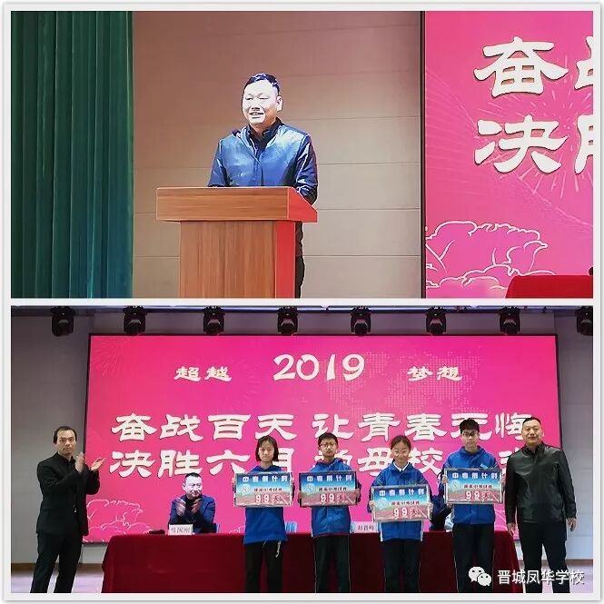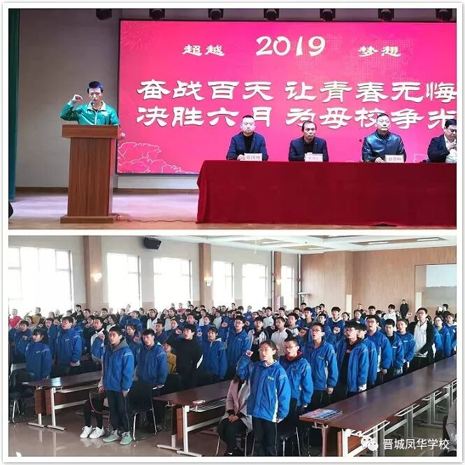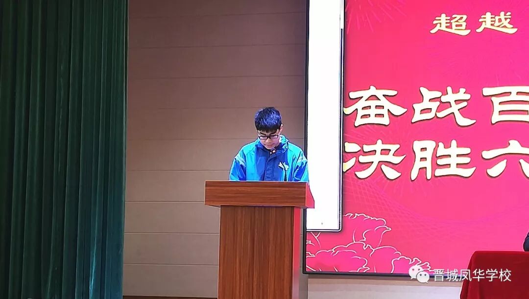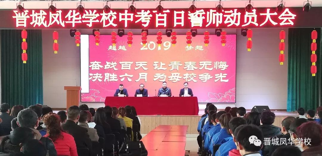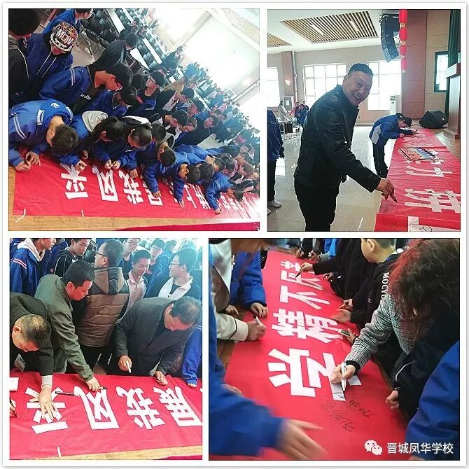春风添画意,岁月赋新诗。2019年3月9日上午,凤华学校初中部毕业班全体师生和家长在思源楼多功能报告厅隆重召开2019届中考百日誓师动员大会。本次大会由初中部副主任毋国刚主持,主席台成员有凤华学校副校长赵晋峰,家长代表耿小亮,教师代表曹峰岩。 誓师大会在一段温馨的视频中拉开了的序幕,悠扬的音乐、温馨的照片,记录了孩子们初中三年生活的点点滴滴,家长和孩子们全神贯注,神情凝固,会场鸦雀无声。 首先,学生代表1601班秦璟琪发言,他代表全体初三学生表态,在最后的一百天中,一定会奋力拼搏,全力以赴,用坚定的意志和顽强的毅力迎接中考。 接着,家长代表耿小亮发言,他首先向台下的老师们深鞠一躬,满含对老师、对学校的感激;深情的致辞,道出了所有家长的心声,他鼓励全体同学放手一搏,不要让青春留下遗憾。 之后,教师代表曹峰岩老师激情发言,他鼓励同学们奋力拼搏100天,给自己一个惊喜,给母校一个奇迹,老师将与同学们风雨兼程,并肩作战,让同学们的梦想在六月绽放异彩! 学生的成长离不开学校领导的悉心关怀。赵校长的讲话也寄予了深深的期望,他不仅鼓励同学们再战百日,还勉励老师们要做有温度的教育,殷殷之情,溢于言表。之后,赵校长为四个毕业班颁发了倒计时牌,并合影留念。 大会在同学们和家长们的庄严宣誓中达到了高潮。那雄壮豪迈的声音充满斗志,他们用声音证明,2019届凤华学生是一只枕戈待旦的威武雄狮,随时等待中考的检阅。 最后,伴随着音乐《我相信》,全体学生和家长都在红色的班级誓言条幅上庄重地签下了自己的名字,作为中考百日冲刺的承诺,并悬挂于课室,时刻提醒同学们奋勇前进。 此次大会,鼓舞了士气,增加了信心,使我校九年级全体师生统一了思想、明确了目标。有家长的陪伴,有优秀毕业生的加油打气,有领导和老师们的默默支持,我校2019届中考一定会取得佳绩,再创辉煌! 供稿:毛雁苹