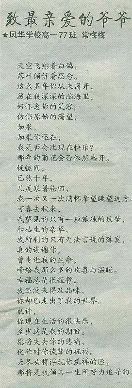 梅梅同学上周末回家到山上散步,途经爷爷坟前,对爷爷的思念之情油然而生。回家后写了《致最亲爱的爷爷》一诗,并向《太行日报》投稿。《太行日报》在2012年11月24日第五版上发表了该诗。该诗虽还有些稚嫩,但小作者对爷爷思念的心理刻画的比较细腻,感情真挚,悲婉而又催人奋进。读后使我们不由地想念自己已故的亲人。希望我们的同学勤观察、勤思考、勤动笔,把我们的身边的真、善、美写下来,积极投稿,为班级增光,为学校添彩。