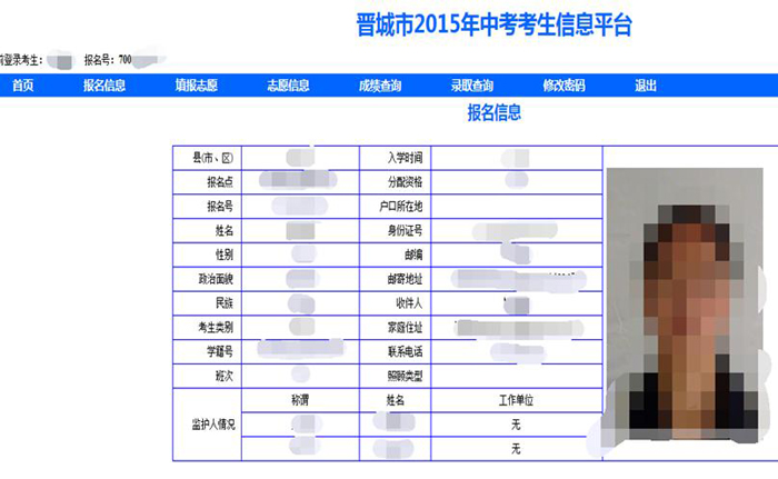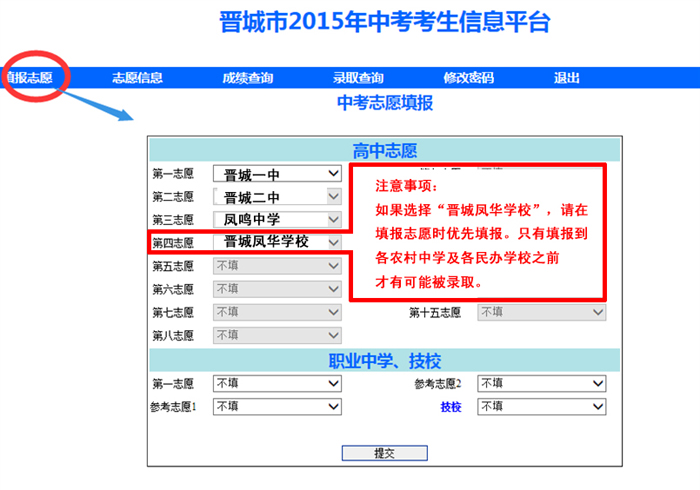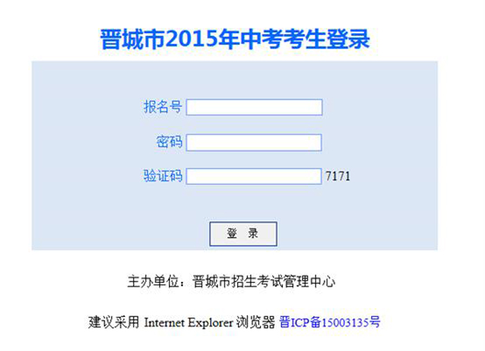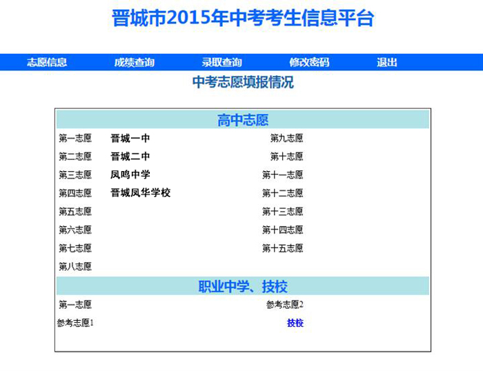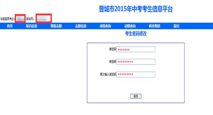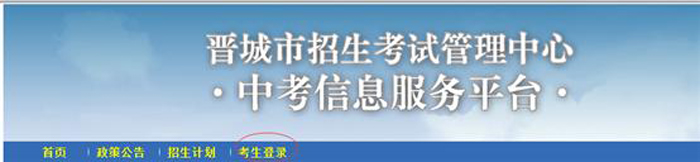 一、登录晋城市招生考试管理中心中考信息服务平台(www.jckszx.cn)。 二、点上图中的“考生登录”,进入下图考生登录界面,输入你的报名号,密码是你身份证后6位。 三、登录成功后,会弹出下面的窗口,左上角会显示你的姓名和报名号。请先修改你的登录密码,要求新密码不能与初始密码相同。修改成功后才可以查看报名信息和填报志愿。 四、点导航条上的报名信息,可以核对本人报名信息。 五、点“填报志愿”,如下图,请依次填写。 六、点“志愿信息“,如下图,可以查看志愿填报情况。